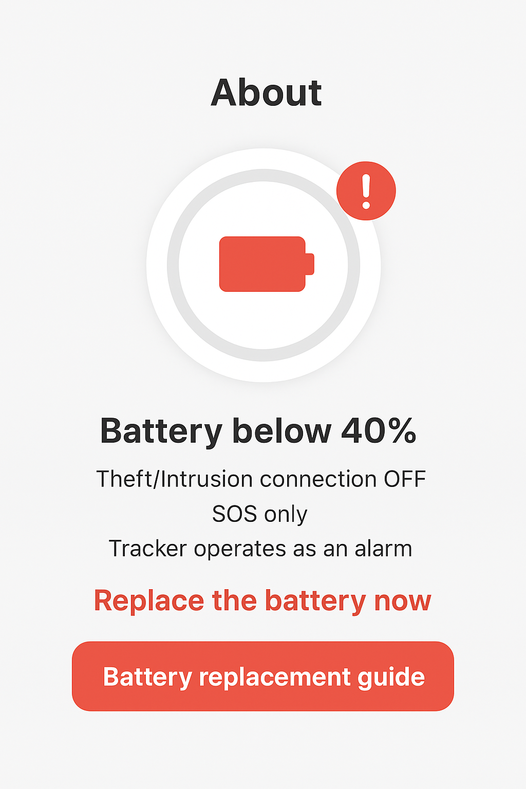 트래커 배터리 40% 이하시 앱 메인 화면에서 배터리 빨강색 표시( 사용 매뉴얼에 '배터리 표시가 빨강색인 경우 트래커 배터리가 40%이하 이므로 도난/침입 연결은 해제됩니다'라고 적어 놓을 예정 )